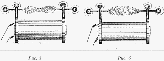 Когда частота возрастает и переходит этот рубеж, конечно, растет и потенциал, но длина дуги тем не менее может уменьшиться, как ни парадоксально это звучит. По мере возрастания потенциала, катушка всё более принимает свойства статической машины, пока, наконец, не появляется возможность наблюдать красивейшее явление текучего разряда (рисунок 5), который может быть равным катушке по длине. В этой стадии на всех концах появляются свободно текущие потоки. Эти потоки можно также наблюдать в большом количестве в промежутке между первичной обмоткой и изоляционной трубкой. Когда потенциал чересчур высок, они появляются всегда: даже если частота низкая и первичная обмотка изолирована целым дюймом сургуча, твердой резины, стекла или другого изолятора. Это значительно ограничивает мощность катушки, но позже продемонстрирую, как мне удалось в значительной степени преодолеть этот недостаток в обычной катушке.