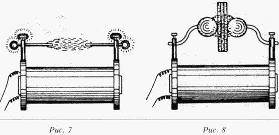 Когда частота настолько высока, что наблюдается разряд, показанный на рисунке 7, без сомнения в обмотке имеет место сильное рассеивание. Тем не менее катушку можно использовать довольно долго, так как нагрев постепенный.
