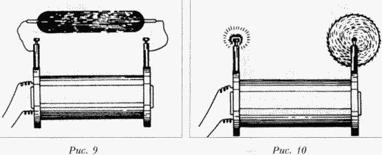 Текущий разряд на катушке индуктивности высокого напряжения во многом отличается от такого же разряда мощной статической машины. Что касается расцветки, то он ни фиолетовый положительный, ни яркий отрицательный статический разряд, а что-то среднее, причем он, естественно, попеременно положительный и отрицательный. Но поскольку поток более мощный, когда острие, или контакт, имеет положительный заряд, то конец пучка более подобен положительному полюсу, а основание — отрицательному при статическом разряде. В темноте, если пучок очень мощный, основание может выглядеть почти белым. Движение воздуха, производимое отходящими потоками, хотя и довольно сильное и его можно почувствовать на расстоянии, тем не менее, учитывая количественные показатели разряда, менее сильное, чем движение воздуха от статической машины, и гораздо слабее воздействует на пламя. Исходя из природы этого явления, мы можем сделать вывод о том, что чем выше частота, тем слабее, конечно, движение воздуха, создаваемое потоками, а при достаточно высоких частотах, при нормальном атмосферном давлении, этого движения совсем нет. При тех частотах, которые можно получить при помощи машины, механический эффект достаточен для вращения большого колеса со значительной скоростью, и эта картина очень красива в темноте из-за множества исходящих потоков (рисунок 10).