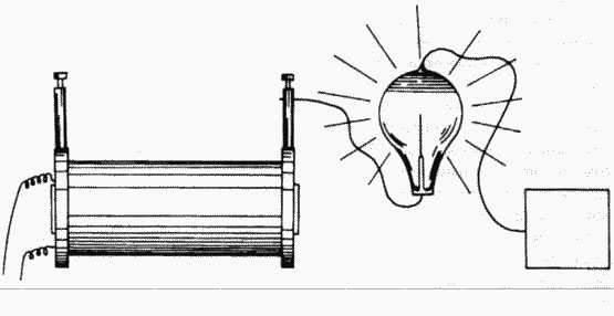 Она не светится потому, что в центре обе половины нейтрализуют друг друга и потенциал равен нулю. Если бы действие было электромагнитным, то трубка ярче всего светилась бы именно в плоскости, проходящей через середину катушки, так как электромагнитный эффект здесь максимальный. Когда между контактами катушки устанавливается дуга, все лампы вокруг гаснут, но зажигаются вновь, когда дуга исчезает по причине повышения напряжения. Хотя электромагнитный эффект должен быть практически таким же в обоих случаях.