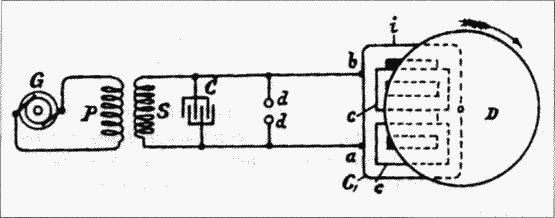 Эффекты, порождаемые резонансом, всё чаще замечаются инженерами и приобретают всё большую важность при работе с любой аппаратурой переменного тока. Следовательно, надо сделать несколько замечаний по поводу этих эффектов. Ясно, если нам удастся практически использовать эффекты электрического резонанса при эксплуатации электроприборов, обратный провод, само собой, станет бесполезным, так как электрические колебания можно передавать при помощи одного провода так же хорошо, как и при помощи двух. Значит, сначала надо ответить на вопрос: «А можно ли производить такие эффекты?» Теория и эксперименты показывают, что в природе это невозможно, так как по мере возрастания колебаний потери в колеблющемся теле и окружающей его среде быстро растут и обязательно останавливают колебания, которые иначе могли бы вырасти бесконечно. Это большая удача, что резонанс в чистом виде получить нельзя, ибо, если бы это было возможно, трудно было бы предугадать, какие опасности поджидали бы бедного экспериментатора. Но до определенной степени резонанс получить возможно, причем степень его проявлений ограничена несовершенством проводника, недостаточной эластичностью среды, или, говоря в общем, фрикционными потерями. Чем меньше эти потери, тем более впечатляют его проявления. То же самое происходит и при механических колебаниях. Толстый металлический брусок может колебаться под воздействием падающих на него с определенным интервалом капель воды; а в случае со стеклом, которое еще более эластично, проявления резонанса еще более значительны, ведь стеклянный бокал можно разбить, если пропеть в него ноту определенного тона. Электрический резонанс получается тем сильнее, чем меньше сопротивление участка цепи и чем лучше изолирующие свойства диэлектрика. При разрядах лейденской банки через толстый многожильный провод с тонкими жилами эти требования удовлетворены наилучшим образом, и резонанс проявляется наиболее выпукло. Так не происходит, однако, в динамо-машинах, цепях трансформатора или в целом в коммерческих устройствах, где наличие сердечника затрудняет проявление резонанса или делает его вовсе невозможным. Что же касается лейденских банок, при помощи которых эффекты резонанса часто демонстрируются, я бы сказал, что они часто приписываются действию резонанса, а не являются его следствием, ибо в этом случае очень легко допустить ошибку. Это убедительно можно проиллюстрировать следующим опытом. Возьмем, к примеру, две изолированные металлические пластины или два шара А и В, расположим на определенном небольшом расстоянии друг от друга и зарядим их при помощи фрикционной машины или электрофорного генератора до такого потенциала, что даже небольшое его изменение вызывает пробой воздушной подушки или изоляции между телами. Этого легко добиться путем предварительных попыток. Теперь, если еще одну пластину, — закрепленную на изолирующей рукоятке и соединенную с одним из выводов вторичной обмотки катушки индуктивности высокого напряжения, которую питает генератор (желательно высокочастотный), — поднести к одному из заряженных тел А или В, причем ближе к одному из них, между ними обязательно произойдет разряд; по крайней мере, он произойдет, если потенциал пластины достаточно высок. Это явление легко объясняется тем фактом, что поднесе
