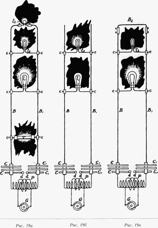 На рисунке 19а В и Bf — толстые медные бруски, нижние концы которых соединены с пластинами конденсатора Си С( соответственно, пластины конденсатора в свою очередь соединены с выводами вторичной обмотки S трансформатора высокого напряжения, первичная обмотка которого Р запи-тана от низковольтной динамо-машины G или обычной сети. Конденсатор, как обычно, разряжается через промежуток dd. Установив быстрые колебания, мне удалось провести следующий любопытный эксперимент. Бруски В и В1сверху соединялись низковольтной лампой немного ниже помещалась на клеммах СС еще одна 50-вольтовая лампа 12; а еще ниже — 100-вольтовая лампа L; и, наконец, на некотором расстоянии ниже вакуумная трубка Т. После тщательной выверки положения всех устройств стало возможным поддерживать в них соответствующий уровень свечения. И всё же они все были параллельно соединены многочисленными дугами с медными брусками и требовали разного напряжения. Этот эксперимент требует, конечно, тщательной настройки, но после этого его вполне легко поставить.