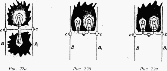 Если нить поместить в однородную среду, весь нагрев будет происходить за счет тока проводимости, но если это будет вакуумный сосуд, то условия будут абсолютно другими. Здесь начинает работать газ и нагрев от тока проводимости, как показывают многие эксперименты, может быть незначительным по сравнению с эффектом от бомбардировки. Это несомненно так, когда контур не замкнут, а потенциал, конечно, высок. Предположим, что тонкая нить помещена в вакуумный сосуд и один ее конец соединен с катушкой высокого напряжения, а другой — с большой изолированной пластиной. Хотя цепь не замкнута, нить, как я уже показывал, сильно накаляется. Если частота и потенциал сравнительно малы, то нить накаляется от проходящего через нее тока. Если частоту и потенциал, последнее важнее, повысить, то пластина может быть небольшой, или ее может не быть совсем; и всё же нить накалена, так как весь накал происходит от бомбардировки. Практически совместить эффекты тока проводимости и бомбардировки можно так, как показано на рисунке 24, где обычная лампа имеет тонкую нить, один конец которой соединен с абажуром, играющим роль пластины, а второй — с источником тока высокого напряжения. Не следует думать, будто для нагревания проводника переменным током важен только разреженный газ, газ при обычном давлении тоже может играть важную роль, если разность потенциалов и частота крайне высоки. По этому поводу я уже заявлял, что когда проводник плавится под ударом молнии, ток, протекающий через него, может быть крайне мал, его может быть даже недостаточно, чтобы нагреть провод, если тот помещен в однородную среду.
