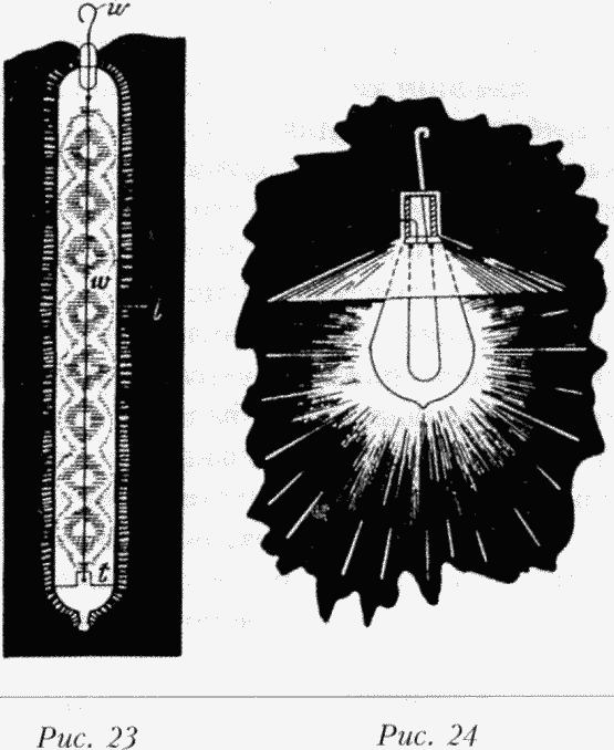 Хочу привести результат, которого добился благодаря наблюдениям во время этих опытов, и который очень интересен. Я заметил, что небольшие различия в плотности воздуха приводили к серьезной разнице в степени накала нитей, и подумал: так как в трубке, через которую проходит световой разряд, плотность газа неоднородна, то очень тонкий провод, помещенный внутрь, может накаляться в местах меньшей плотности газа и в то же время оставаться темным в местах большей плотности, где конвекция сильнее, а бомбардировка менее интенсивна. В соответствии с этой мыслью была приготовлена трубка (;, как показано на рисунке 23, через центр которой проходил очень тонкий платиновый провод w. Из трубки был частично откачан воздух, и было обнаружено, что когда ее соединяли с выводом высокочастотной катушки, платиновый провод и в самом деле накалялся участками, как показано на рисунке 23. Позже было изготовлено несколько таких трубок с одним или несколькими проводами, и каждая из них показывала одинаковый результат. Этот эффект был особенно заметен, когда появлялся полосчатый разряд, но также имел место, когда полосы не были заметны, что говорило о том, что плотность газа в трубке неоднородна. Полосы обычно располагались так, что места наибольшего разрежения соответствовали участкам наибольшего или большей яркости свечения провода w. Но через несколько мгновений становилось заметным, что яркие участки провода покрыты плотными полосами разряда, как показано буквами // на рисунке 23, хотя это явление и было трудноразличимо. Это логично объяснялось, если предположить, что конвекция не сильно различалась на плотных и разреженных участках, а бомбардировка была сильнее на плотных участках полосчатого разряда. В лампах, на самом деле, можно часто наблюдать такую картину, когда тонкий провод накаляется сильнее, если газ не сильно разрежен. Так случается, когда потенциал катушки недостаточен для вакуума, но такой результат можно объяснить разными причинами. Во всяком случае, это любопытное явление накаливания исчезает, когда трубка, или, скорее, провод в трубке равномерно нагревается.