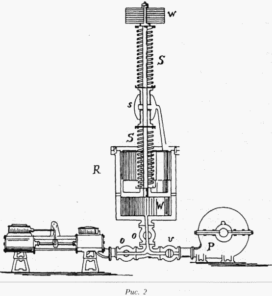 Что касается общего принципа, лежащего в основе этих преобразователей, или, выражаясь более точно, электрических осцилляторов, то он довольно прост, и был выдвинут мною пять или шесть лет назад. Конденсатор заряжается от любого доступного источника, а затем любым удобным способом разряжается через цепь, содержащую, как в данном случае, первичную обмотку трансформатора. На рисунке 1 показаны генератор G, конденсатор С, а для зарядки и разрядки последнего предусмотрен прибор Ь, работающий так, чтобы создавать постоянное прерывание в диэлектрике. Если контур L, который содержит высоко- или низковольтный прибор, через который разряжается конденсатор, правильно настроен, то возникают крайне быстрые электрические вибрации, какие, насколько мы знаем, невозможно получить иным способом; эти колебания, в свою очередь, индуцируют в соседней цепи подобные же колебания, дающие любопытные эффекты. Познакомившись с ними уже тогда, когда законы, управляющие этими явлениями, еще не были до конца изучены, я сохранил в памяти некоторые понятия, сформированные в то время, которые, несмотря на примитивизм, сохраняют актуальность в свете наших расширившихся познаний. Я связал конденсатор с резервуаром R, в который при помощи насоса Р подается несжимаемая жидкость W, подобная воде, через трубу р, как показано на рисунке 2, где жидкость представляет собой электричество, насос — это генератор, а труба — это соединительный провод. Резервуар имеет подвижное дно В, которое удерживается в верхнем положении пружиной S' и открывает шлюзы оо, когда уровень жидкости достиг определенной отметки и ее давления достаточно для того, чтобы преодолеть сопротивление пружины. Дополняют модель переменный груз ш, винт 5, меняющий сопротивление пружины, и клапан v, служащий для регулирования потока жидкости. Когда дно поддается, жидкость в резервуаре начинает двигаться с некоей скоростью, приобретая механический момент, что приводит к возрастанию давления на дно и оно движется выше, вследствие чего в сосуд поступает жидкости больше, чем может пропустить подающая труба, и пружина занимает свое прежнее положение, вновь закрывая шлюзы, после чего процесс повторяется вновь с более или менее быстрой последовательностью. Это движение дна вверх и вниз можно сравнить с прерыванием и восстановлением прово-Рис. 1 дящего контура, фрикционное сопротивление механической системы — с омическим сопротивлением, и, очевидно, инерцию движущихся предметов — с самоиндукцией электрической цепи. Теперь становится очевидным: для того, чтобы поддерживать движение системы без использования дополнительных устройств, средняя скорость подачи через трубу должна быть меньше средней скорости отдачи из сосуда, ибо, если будет наоборот, то шлюзы так и останутся открытыми и колебания прекратятся. Чем более скорость подачи приближается к скорости опорожнения, тем быстрее колебания дна; и если мы поразмышляем над простыми механическими принципами, то нам тем более станет ясно, что если подача воды идет настолько же быстро, насколько дно колеблется само по себе, то и амплитуда колебаний будет наивысшей, давление на дно будет наивысшим, и наибольшее количество воды будет вытекать через шлюзы. Все эти соображения верны и для электрической цепи, и во время опытов с высокочастотными устройствами, в к