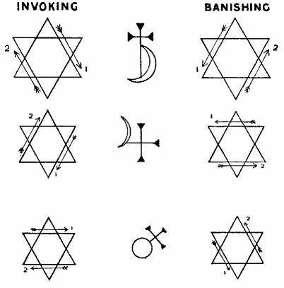 Ритуал Изгнания такой же, за исключением того, что Гексаграммы должны чертиться в обратном направлении.
