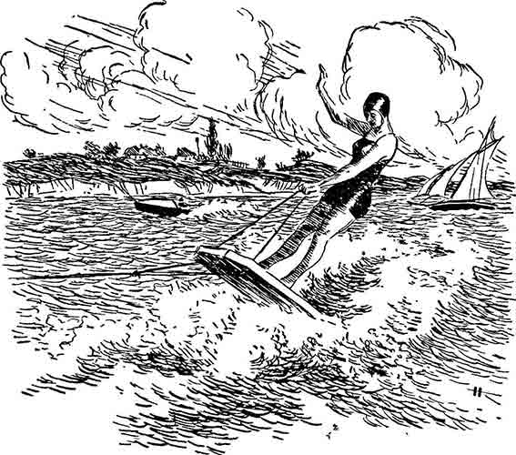 Из-за мыска, тарахтя подвесным мотором, выбежал быстроходный спортивный катер, тащивший на буксире широкую доску. А на доске, стоя во весь рост и держа ее на узде, как коня, неслась в пене и брызгах девушка. Она была в темном лоснящемся купальном костюме и в резиновой шапочке.
