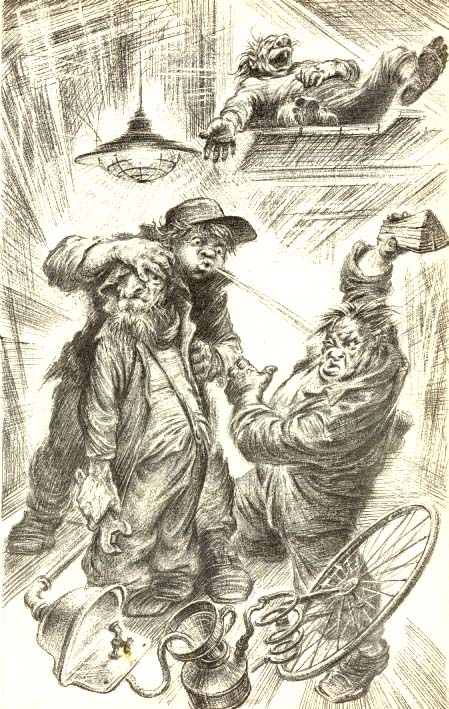 Часом позже мы сидели дома — все, кроме дяди Леса, — как вдруг открывается дверь и входит дядя Лес, а за ним, шатаясь, — прохвессор. Вид у Гэлбрейта был самый жалкий. Он опустился на пол, тяжело, с хрипом, дыша и тревожно поглядывая на дверь.