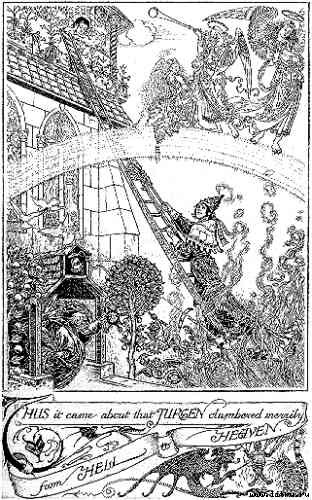 По обе стороны от Бога Юргеновой бабушки стояло еще двенадцать престолов поменьше, образуя два полукруга. На низких престолах сидели добрые на вид старые ангелы с длинными белыми волосами, в венцах и белых одеждах, держа в одной руке арфу, а в другой золотую фляжку емкостью около пинты. И повсюду трепетали и сверкали многоцветными крылами серафимы и херувимы, похожие на увеличенных в размерах попугаев, и они плавно и радостно порхали в золотой дымке, висевшей над Раем, под постоянное звучание приглушенной органной музыки и отдаленного, почти неразличимого пения.