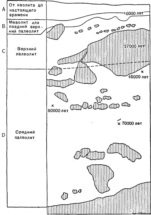 Дно пещеры относится, несомненно, к эпохе более 100 000 лет назад. Таким образом, это единственное известное до сих пор место раскопок, содержащее полную историю за столь длительный период времени. Говоря точнее — неполную. Не хватает одного слоя. Имеется явный перерыв во времени. Низ слоя В соответствует эпохе 10 000 лет до н. э., верх же следующего слоя С относится к эпохе 27 000 лет до н. э. Таким образом, нет слоя периода от 27 000 до 10 000 лет до н. э.