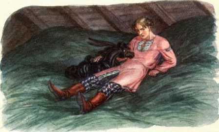 Ясный полдень наступает;Царь-девица подплывает,Входит с гуслями в шатёрИ садится за прибор.«Хм! Так вот та Царь-девица!Как же в сказках говорится, —Рассуждает стремянной, —Что куда красна собойЦарь-девица, так что диво!Эта вовсе не красива:И бледна-то и тонка,Чай, в обхват-то три вершка;А ножонка-то ножонка!Тьфу ты! Словно у цыплёнка!Пусть полюбится кому,Я и даром не возьму».Тут царевна заигралаИ столь сладко припевала,Что Иван, не зная как,Прикорнулся на кулак;И под голос тихий, стройныйЗасыпает преспокойно.