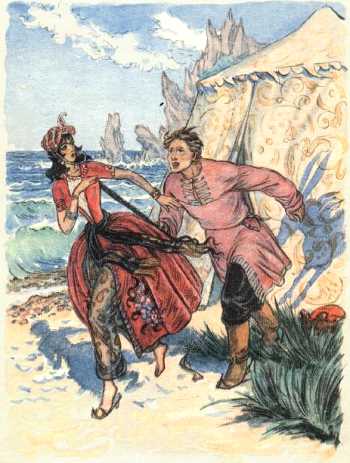 На другой день, поутру,К злотошвейному шатруЦарь-девица подплывает,Шлюпку на берег бросает,Входит с гуслями в шатёрИ садится за прибор…Вот царевна заигралаИ столь сладко припевала,Что Иванушке опятьЗахотелося поспать.«Нет, постой же ты, дрянная! —Говорит Иван, вставая. —Ты вдругорядь не уйдёшьИ меня не проведёшь.»Тут в шатёр Иван вбегает,Косу длинную хватает…«Ой, беги, конёк, беги!Горбунок мой, помоги!»Вмиг конёк к нему явился.«Ах, хозяин, отличился!Ну, садись же поскорей!Да держи её плотней!»