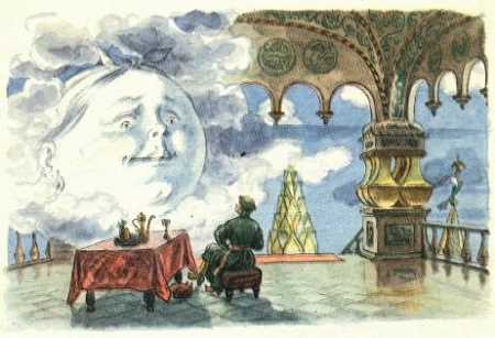 Тут Иванушка поднялся,С светлым Месяцем прощался,Крепко шею обнимал,Трижды в щёки целовал«Ну, Иванушка Петрович! —Молвил Месяц Месяцович. —Благодарствую тебяЗа сынка и за себя.Отнеси благословеньеНашей дочке в утешеньеИ скажи моей родной:«Мать твоя всегда с тобой;Полно плакать и крушиться:Скоро грусть твоя решится, —И не старый, с бородой,А красавец молодойПоведёт тебя к налою.»Ну, прощай же! Бог с тобою!»Поклонившись, как умел,На конька Иван тут сел,Свистнул, будто витязь знатный,И пустился в путь обратный.