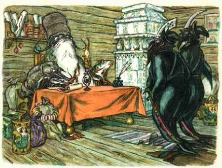 Вот в село он прибегает,Мужичков к себе сзывает,Чёрной гривкою трясётИ такую речь ведёт:«Эй, послушайте, миряне,Православны христиане!Коль не хочет кто из васК водяному сесть в приказ,Убирайся вмиг отсюда.Здесь тотчас случится чудо:Море сильно закипит,Повернётся Рыба-кит…»Тут крестьяне и миряне,Православны христиане,Закричали: «Быть бедам!»И пустились по домам.Все телеги собирали;В них, не мешкая, поклалиВсё, что было живота,И оставили кита.Утро с полднем повстречалось,А в селе уж не осталосьНи одной души живой,Словно шёл Мамай войной!
