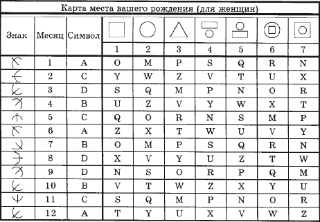 Найдите букву вашего года рождения. Если вы в верхней части таблицы – вы были мужчиной в вашей первой жизни, в нижней – женщиной. На вершине колонки с вашей буквой вы найдёте символ вашего типа и цифру вашей профессии, слева от буквы (рядом с месяцем) ориентационный знак и букву вашей профессии. Соедините их вместе и занесите в таблицу № 9.