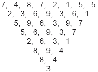 б) закончив основание, или первый ряд чисел треугольника, нужно составить под ним второй, складывая первые два числа слева (7 + 4=11), а из суммы вычитая 9 (11 – 9=2). Остаток 2 подписать внизу между 7 и 4. Потом сложить второе и третье числа (4 + 8=12), вычесть из суммы 9 (12 – 9=3), остаток 3 подписать внизу между 4 и 8. Затем сложить 8 и 7 и т. д. до конца ряда.