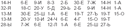 6. Наконец, таким образом написав полученный во всех пяти таблицах цифровой ряд, подпишем под каждой цифрой соответствующую ей букву по приведённой выше азбуке, отчего получится ответ на предложенный вопрос: