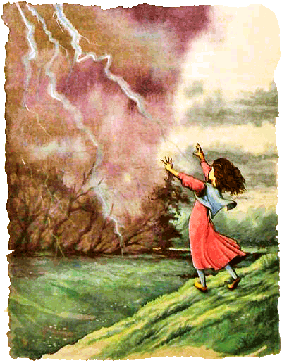 Деревня опустела, все ее обитатели попрятались кто куда. Девочка вышла за околицу и пошла навстречу грохочущей туче. Поднявшись на вершину небольшого холма, Корина прокричала слова отгоняющего заклинания: