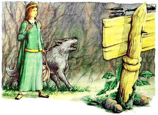 – Посмотри, хозяйка! – вместо ответа сказал Нарк. Он подбежал к перекрестку. Вправо от большой дороги уходила поросшая травой и усыпанная белыми камнями тропинка. В самом ее начале стоял покосившийся трухлявый столб, на котором висела на одном гвозде широкая доска. На ней было коряво написано: