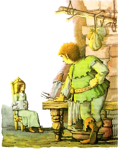 Кряхтя и жалуясь на тяжелую жизнь, молодой людоед поплелся в угол зала и спустился по лестнице в подвал. А Корина засучила рукава платья и взялась за дело. На камине лежал кем-то забытый мешок – он годился в качестве тряпки. Девушка нашла во дворе помятое медное ведро и набрала в колодце воды. Стол не убирали, наверное, несколько месяцев, но девушка привыкла за время своих странствий к самой тяжелой домашней работе. Ей даже в голову не пришло использовать волшебные заклинания – да и зачем, когда есть тряпка и вода?