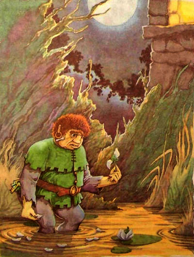 Корина подошла к окну и выглянула наружу. В лунном свете она разглядела людоеда, который стоял по колени в болотистой жиже, заполнявшей ров. С головы Людушки свисали водоросли. Около ног весело квакали лягушки. Вид у молодого людоеда был настолько жалким, что волшебница не выдержала и рассмеялась.