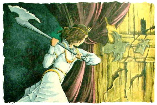 Сам Дровосек позавидовал бы мощи ударов и неутомимости принцессы. Наконец что-то за дверью звякнуло, и одна из створок распахнулась внутрь. Тяжело дыша, Корина отложила топор и вошла в комнату, держа перед собой горящую свечу.