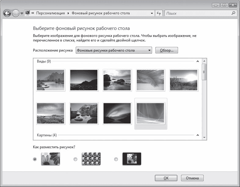 При желании вы можете разместить на Рабочем столе собственный рисунок или фотографию. Для этого откройте список Расположение рисунка и выберите папку, в которой он хранится. По умолчанию для выбора предлагаются стандартные папки для хранения изображений. Если же ни в одной из них нет искомого рисунка, нажмите кнопку Обзор, выберите папку вручную и щелчком кнопки мыши выделите нужное изображение.