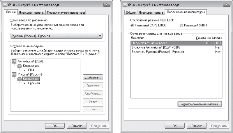 Рис. 2.23. Вкладки настройки языков ввода (слева) и переключения клавиатуры (справа)