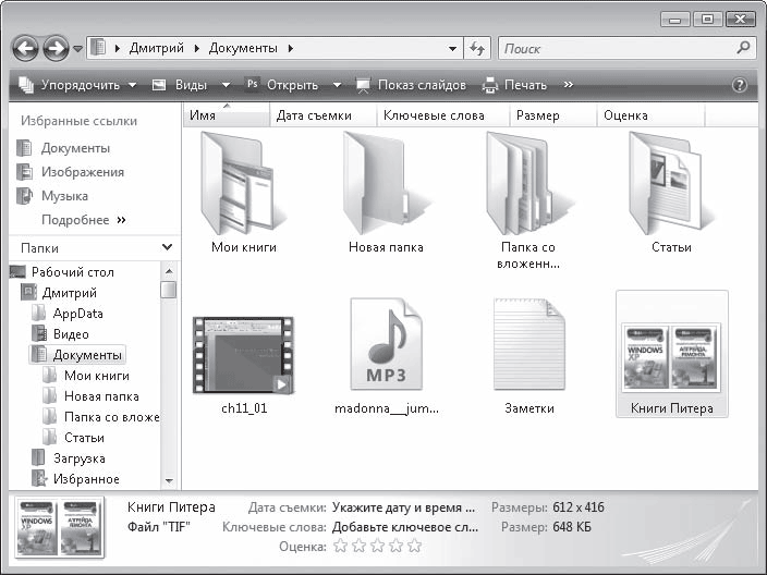 • В области содержимого папки отображаются значки файлов и папок, находящихся в открытом каталоге. Отображение значков в Проводнике значительно улучшилось. Теперь значок папки содержит эскизы файлов, находящихся внутри нее (см. первый значок на рис. 3.1), при наличии вложенной папки она также отображается на значке в виде эскиза (см. третий значок на рис. 3.1), значки мультимедийных файлов (рисунков, видео) также представлены в виде эскизов. Вариантов отображения значков, по сравнению с предыдущими версиями Проводника, стало больше. Подробнее о них будет рассказано позже.