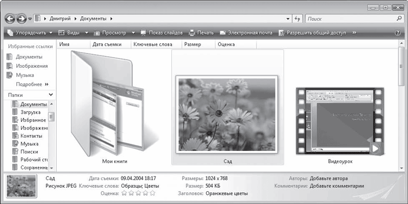 • Плитка – значки всех объектов имеют средний размер и подробные подписи, в которых серым шрифтом указан тип файла и его размер (для изображений выводится размер в пикселах по горизонтали и вертикали) (рис. 3.7).