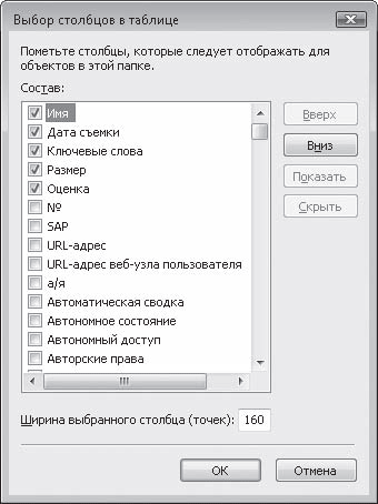 Щелчком кнопки мыши на заголовке любого столбца вы можете отсортировать содержимое папки по возрастанию выбранного признака. Повторный щелчок кнопкой мыши сортирует объекты по убыванию признака. Как говорилось ранее, столбцы подбираются системой автоматически в зависимости от содержимого папки, но вы всегда можете изменить их набор в окне, изображенном на рис. 3.6. Сортировку можно проводить по любому из добавленных столбцов.