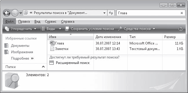 Рис. 3.10. Результат поиска файлов в папке Документы