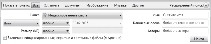 Каждый раз, выполнив процедуру поиска, система предлагает провести расширенный поиск в случае, если требуемый результат не был достигнут. Чтобы визуализировать панель расширенного поиска (рис. 3.11), перейдите по ссылке Расширенный поиск, которая расположена внизу под результатами поиска. Окно расширенного поиска также можно открыть, выполнив команду Пуск -> Поиск и нажав кнопку Показать дополнительные фильтры.