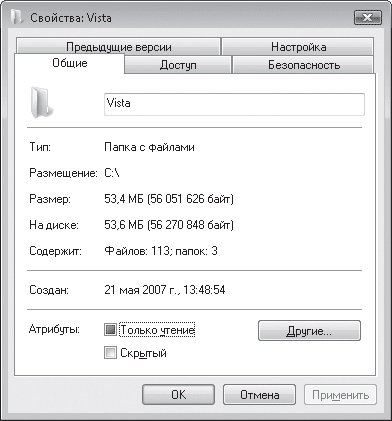 • На вкладке Предыдущие версии можно восстанавливать предыдущие версии файлов и папок. Эта новая возможность Windows Vista будет рассмотрена в следующем подразделе.