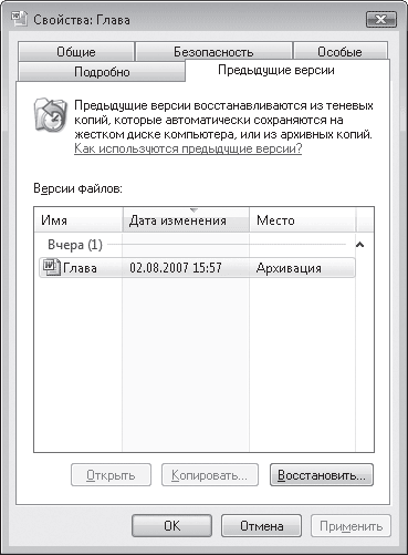 Чтобы получить доступ к предыдущим версиям файла или папки, щелкните правой кнопкой мыши на значке объекта, выполните команду Свойства и в открывшемся окне перейдите на вкладку Предыдущие версии. Если для данного объекта были созданы теневые или резервные копии, вы увидите их в списке (рис. 3.21).