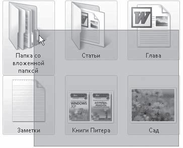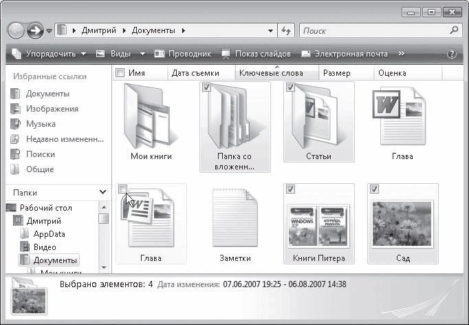 В Windows Vista появился новый прием выделения объектов без использования клавиатуры – с помощью флажков. Чтобы включить отображение флажков для значков в Проводнике, выполните команду Упорядочить -> Свойства папок и поиска, в открывшемся окне перейдите на вкладку Вид и установите флажок Использовать флажки для выбора элементов. После этого при наведении указателя мыши на любой значок в его верхней части будет появляться окно флажка. Щелкнув на нем кнопкой мыши, вы установите флажок, выделив таким образом объект, а повторным щелчком снимете выделение. Последовательно устанавливая флажки для разных объектов, вы можете выделить неограниченное их количество, не удерживая нажатыми клавиши на клавиатуре (рис. 3.23). Чтобы одновременно снять флажки для нескольких объектов, просто щелкните кнопкой мыши на свободном участке области содержимого папки.