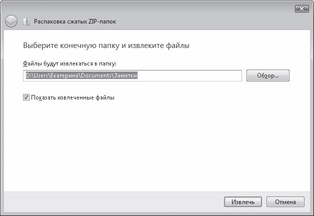 Имейте в виду, что запуск файлов программ из ZIP-папки возможен только в том случае, если приложение состоит лишь из одного исполняемого файла. При наличии нескольких файлов необходимо разархивировать объекты. Сделать это можно двумя способами: либо путем обычного копирования, либо обратившись к специальному мастеру. Щелкните правой кнопкой мыши на ZIP-папке и выполните команду Извлечь все. В открывшемся окне (рис. 3.26) будет предложен путь к папке для распаковки файлов.