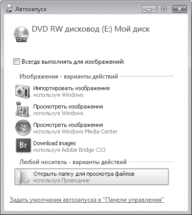 У вас есть возможность провести настройку автозапуска дисков с различным содержимым. В нижней части окна есть ссылка Задать умолчания автозапуска в "Панели управления". Щелкнув на ней кнопкой мыши, вы откроете окно, в котором сможете включить использование автозапуска для любых сменных носителей, установив флажок в верхней части окна, а также выбрать в раскрывающихся списках действие, которое система должна выполнять по умолчанию, обнаружив определенное содержимое на том или ином диске.