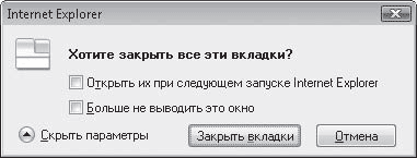 При попытке закрыть окно Internet Explorer, содержащее несколько вкладок, появится предупреждающее диалоговое окно. Перейдя в нем по ссылке Показать параметры, вы увидите настройки, отвечающие за дальнейшие действия с вкладками (рис. 4.10).