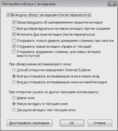 Обзор с вкладками можно настроить в специальном окне. Чтобы его открыть, нажмите на панели инструментов кнопку Сервис и выполните команду Свойства обозревателя. В группе Вкладки нажмите кнопку Параметры. Откроется окно, показанное на рис. 4.11.