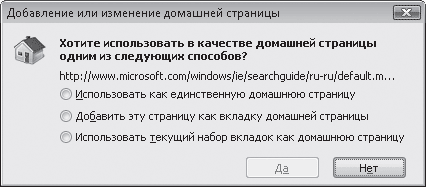 Если открыто несколько вкладок, то в окне (рис. 4.18) нужно будет выбрать одно из трех положений переключателя. Первое отвечает за добавление содержимого текущей вкладки как единственной домашней страницы (с удалением предыдущих страниц), второе – за пополнение списка домашних страниц новой, третье – за сохранение всей группы вкладок в качестве набора домашних страниц. Если вы открыли только одну страницу, в окне будут присутствовать только два первых переключателя.