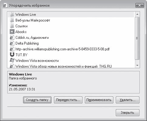 Когда список избранных ссылок станет длинным, поиск нужной страницы будет занимать много времени. Чтобы этого избежать, структурируйте содержимое списка – распределите ссылки на сайты схожей тематики по папкам, измените заголовки некоторых страниц, удалите редко используемые ссылки. Для этого нажмите кнопку Добавить в избранное и выберите пункт Упорядочить избранное. В открывшемся окне (рис. 4.21) выполните перечисленные операции, используя доступные кнопки.