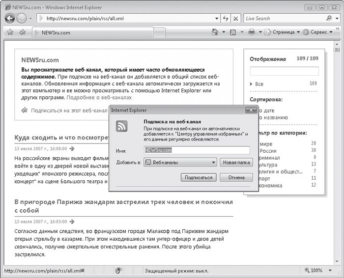 В Internet Explorer 7 появилась возможность обнаружения RSS-каналов на сайте. При их наличии становится доступной кнопка Веб-каналы на панели инструментов. Щелкнув на стрелке этой кнопки, вы развернете список имеющихся веб-каналов. Сайт может иметь один или несколько RSS-каналов, один и тот же канал иногда представлен в различных форматах, например для просмотра на компьютере и на мобильном устройстве. Щелкните кнопкой мыши на названии RSS-канала. При этом его содержимое отобразится в окне Internet Explorer. Чтобы подписаться на выбранный веб-канал, перейдите по ссылке Подписаться на этот веб-канал. В открывшемся окне (рис. 4.22) измените при необходимости имя веб-канала и нажмите кнопку Подписаться. После этого его название появится на вкладке Веб-каналы Центра управления избранным. Для просмотра веб-канала нужно щелкнуть кнопкой мыши на его названии на вкладке Веб-каналы.