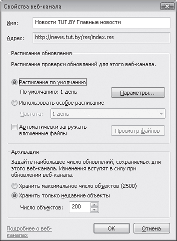 справа от названия канала на вкладке Веб-каналы. Кроме того, вы можете задать особое расписание обновления канала. Для этого щелкните правой кнопкой мыши на названии канала в списке и выполните команду Свойства. В открывшемся окне (рис. 4.24) установите переключатель в положение Использовать особое расписание и в списке Частота выберите нужный временной интервал. Здесь же вы можете разрешить автоматическую загрузку вложенных файлов, установив соответствующий флажок, а также указать количество хранимых обновлений.