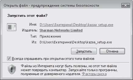 После того как файл из Интернета будет загружен на ваш компьютер, не спешите открывать его, не убедившись в том, что он не содержит вирусов и шпионских программ. Для проверки используйте антивирусную программу с последними обновлениями. Следует также обратить внимание на то, есть ли у файла цифровая подпись – реквизит, подтверждающий источник распространения файла и его подлинность. Перед запуском скачанного EXE-файла система безопасности откроет окно проверки цифровой подписи, в котором вместе с именем, типом файла и местом его нахождения вы увидите название издателя, что подтверждает наличие цифровой подписи, гарантирующей подлинность файла и его безопасность для вашего компьютера (рис. 4.29). В этом случае можно не проверять файл с помощью антивируса.