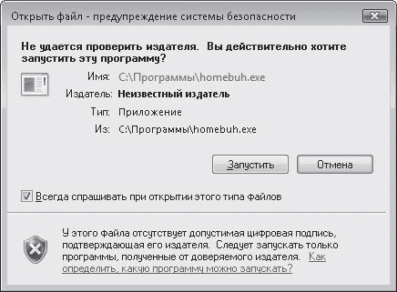 При отсутствии цифровой подписи в окне появится сообщение Не удается проверить издателя (рис. 4.30). В этом случае вероятность того, что файл заражен, выше, поэтому проверка антивирусной программой обязательна. Однако имейте в виду, что далеко не все разработчики программного обеспечения прикладывают к своим продуктам цифровую подпись, поэтому файл, не содержащий ее, совсем не обязательно является пиратским или зараженным.