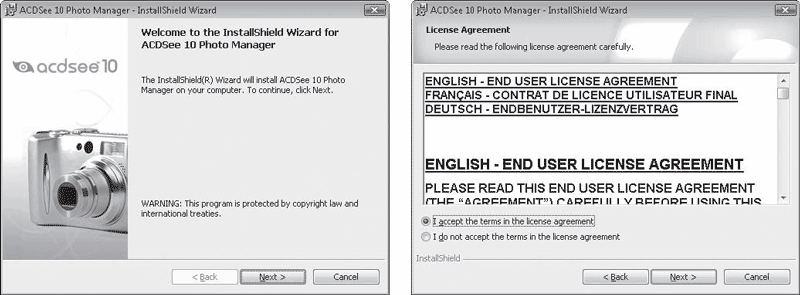 Рис. 5.2. Приветствие программы установки (слева) и окно лицензионного соглашения (справа)