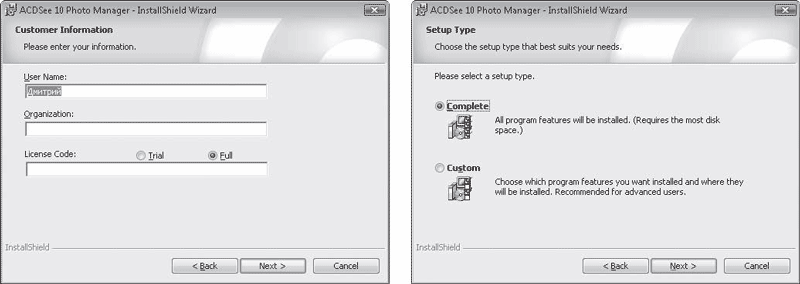 На следующем этапе может потребоваться ввести персональные данные: имя, название организации и регистрационный код для полнофункциональной (Full) версии, если таковой был вами получен (рис. 5.3, слева). Если вы не зарегистрированы, а программа может работать в ознакомительном варианте, опробуйте ее, установив переключатель (или другой элемент управления) в положение Trial (Ознакомительный режим) или Demo (Демонстрационный режим). Нажмите кнопку Next (Далее) для перехода к следующему этапу.