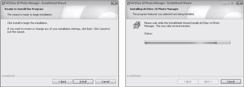 Когда все параметры установки заданы, нажав кнопку Next (Далее), вы подойдете к непосредственной стадии установки. В окне вы увидите сообщение Click Install to begin the installation (Нажмите Install (Установить) для начала инсталляции) (рис. 5.4, слева). Последуйте ему, чтобы запустить установку приложения на компьютер. Как говорилось ранее, в процессе инсталляции (каждый этап которого сопровождается сообщениями и движением индикатора прогресса (рис. 5.4, справа)) файлы программы будут помещены в папку, расположенную в системном каталоге Program Files на жестком диске, ярлыки приложения будут созданы в меню Пуск и в некоторых случаях на Рабочем столе. Информация о программе пропишется в системном реестре – специальной базе данных, содержащей сведения обо всех настройках и параметрах Windows, аппаратного обеспечения компьютера, а также о зарегистрированных пользователях и установленных программах.