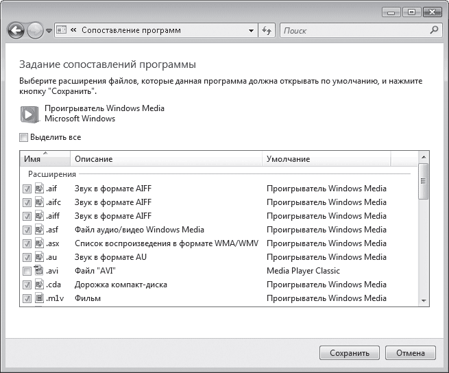Обратившись к команде Выбрать программу рассматриваемого подменю, вы откроете окно, в котором можно задать другое приложение для работы по умолчанию с данным типом файлов. Щелчком кнопки мыши выделите значок желаемой программы в списке, убедитесь, что установлен флажок Использовать выбранную программу для всех файлов такого типа, и нажмите кнопку ОК. Отныне по умолчанию файлы аналогичного формата будут открываться в выбранном приложении.